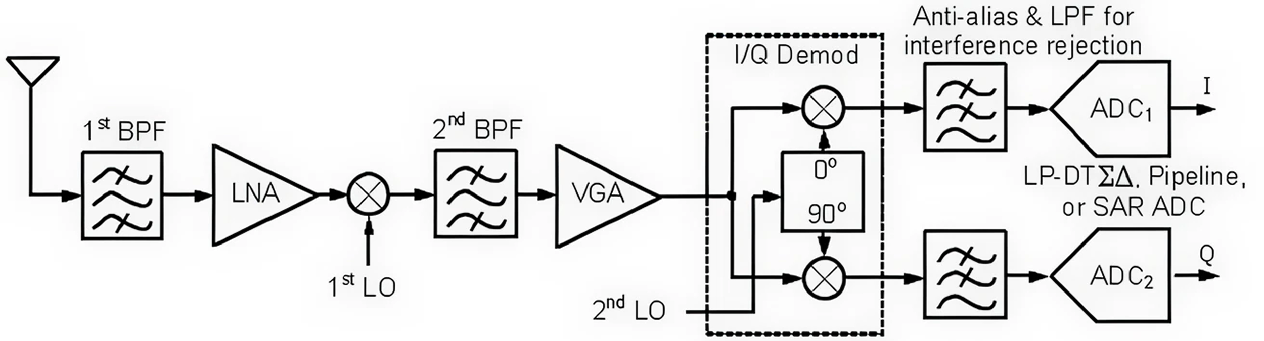 Superheterodyne IQ receivers with pipeline, or SAR (successive approximation) low-pass ADCs mostly applied in consumer smartphones, (LNA = low noise amplifier, VGA = variable gain amplifier, LO = local oscillator, BPF = passive bandpass filter).